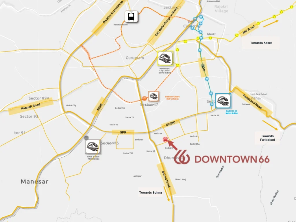TP Downtown 66 is a thoughtfully planned residential project located in Sector 66 Gurgaon, one of the well-connected areas of the city. Spread across 4.25 acres, the development includes 3 residential towers with around 504 units. The project focuses on creating a comfortable living environment where residents can enjoy open space, practical home layouts, and everyday lifestyle facilities. The expected possession timeline is October 2032, which allows buyers to plan their future home or long-term investment with clarity. The homes in BPTP Downtown 66 Sector 66 Gurgaon fall in the premium residential segment, with prices starting from ₹5.2 Cr and going up to ₹5.8 Cr. The design approach keeps daily living needs in mind. Apartments receive natural light and ventilation, while common areas provide space for relaxation and community activities. Residents will also have access to facilities such as a clubhouse, swimming pool, fitness center, landscaped gardens, jogging tracks, children’s play area, and dedicated parking spaces. The project also includes security systems and maintained green areas to support a comfortable residential environment. The location adds further value to BPTP Downtown 66 Gurgaon. The project is close to Golf Course Extension Road, which connects the area to major office hubs, schools, healthcare centers, and retail destinations. Residents can also reach Sohna Road and NH-48 with ease, making daily travel across Gurgaon and nearby parts of Delhi convenient.